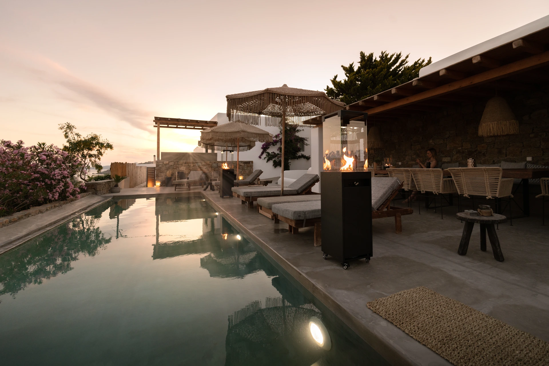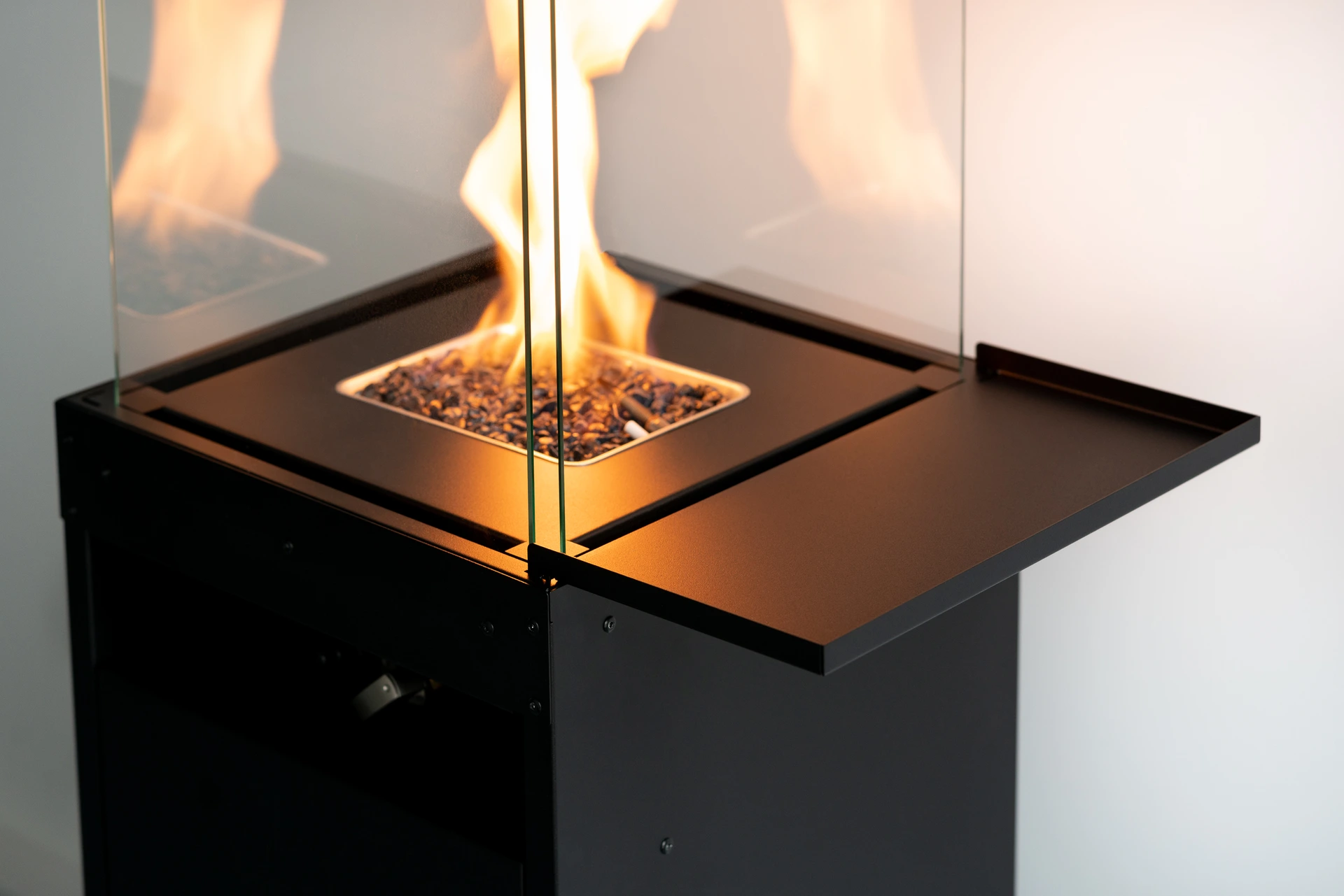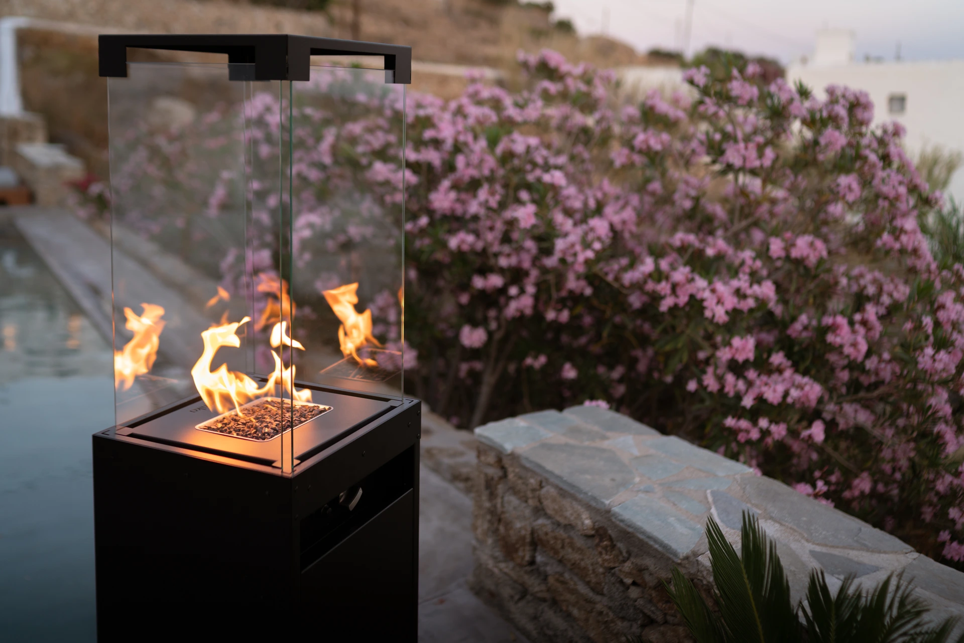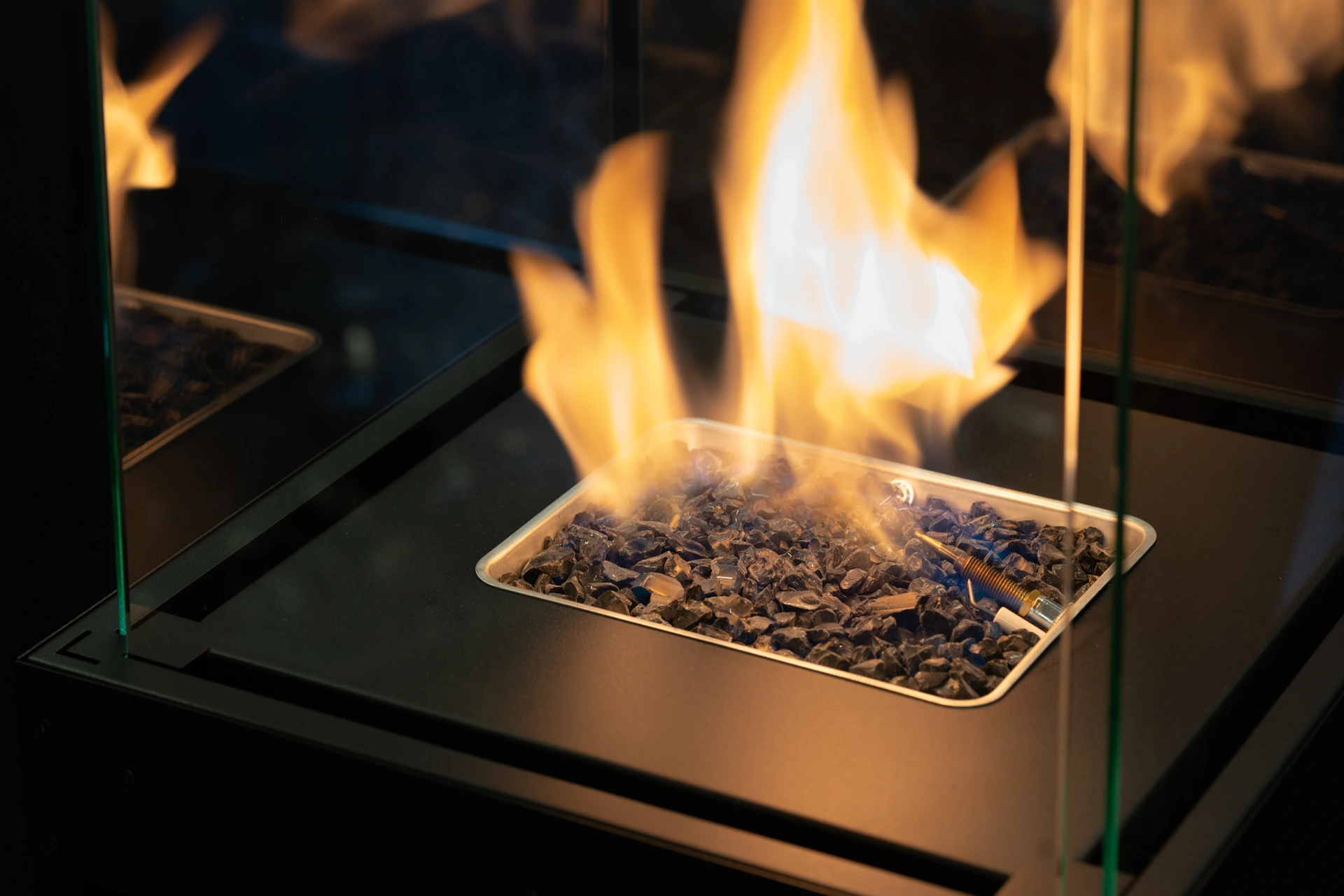 Ergonomski oblik obezbeđuje ravnomernu distribuciju toplote. Gorionik je sa 4 strane pokriven staklenim panelima i čeličnim poklopcem sa gornje strane koji u slučaju kiše štiti plamen od gašenja. Kućište premazano crnim slojem praha čini kamin otpornim na oštećenja. Paneli od kaljenog stakla su pouzdana zaštita dece i kućnih ljubimaca od vatre, a u slučaju vetrovitog vremena čuvaju plamen.